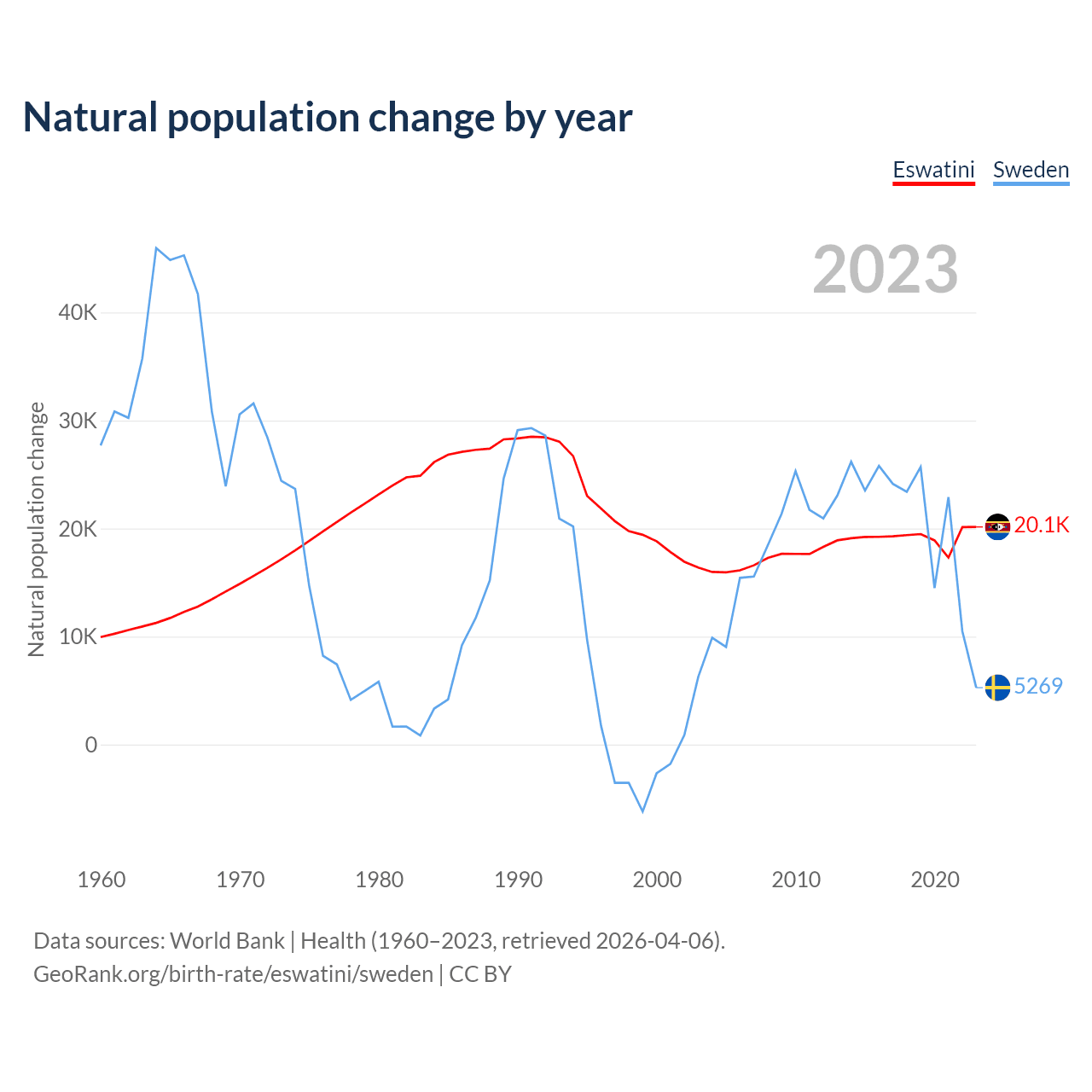 Eswatini has an annual birth rate of 24.1 births per 1,000 people, compared to 9.5 for Sweden. The average number of children a woman is expected to have during her lifetime — the fertility rate, is 2.75 in Eswatini and 1.45 in Sweden — 47.3% difference.