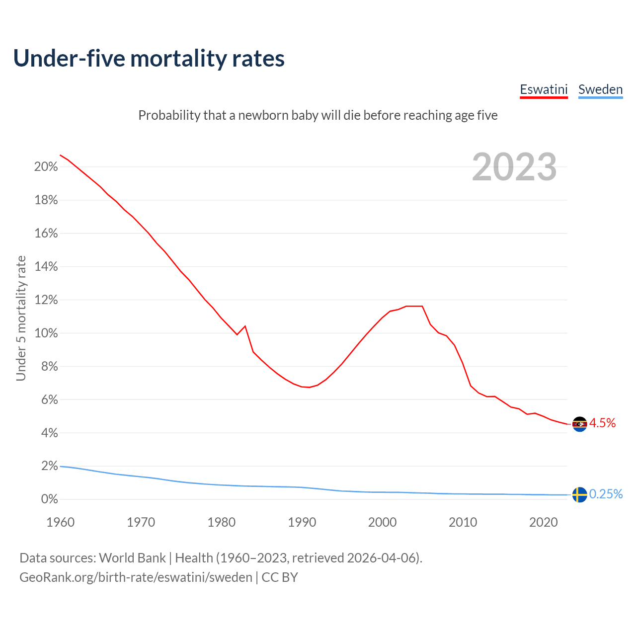 The chance that a newborn baby will die before reaching age five is 4.5% in Eswatini and 0.25% in Sweden. Above is a chart with historical data on under-five mortality rates.