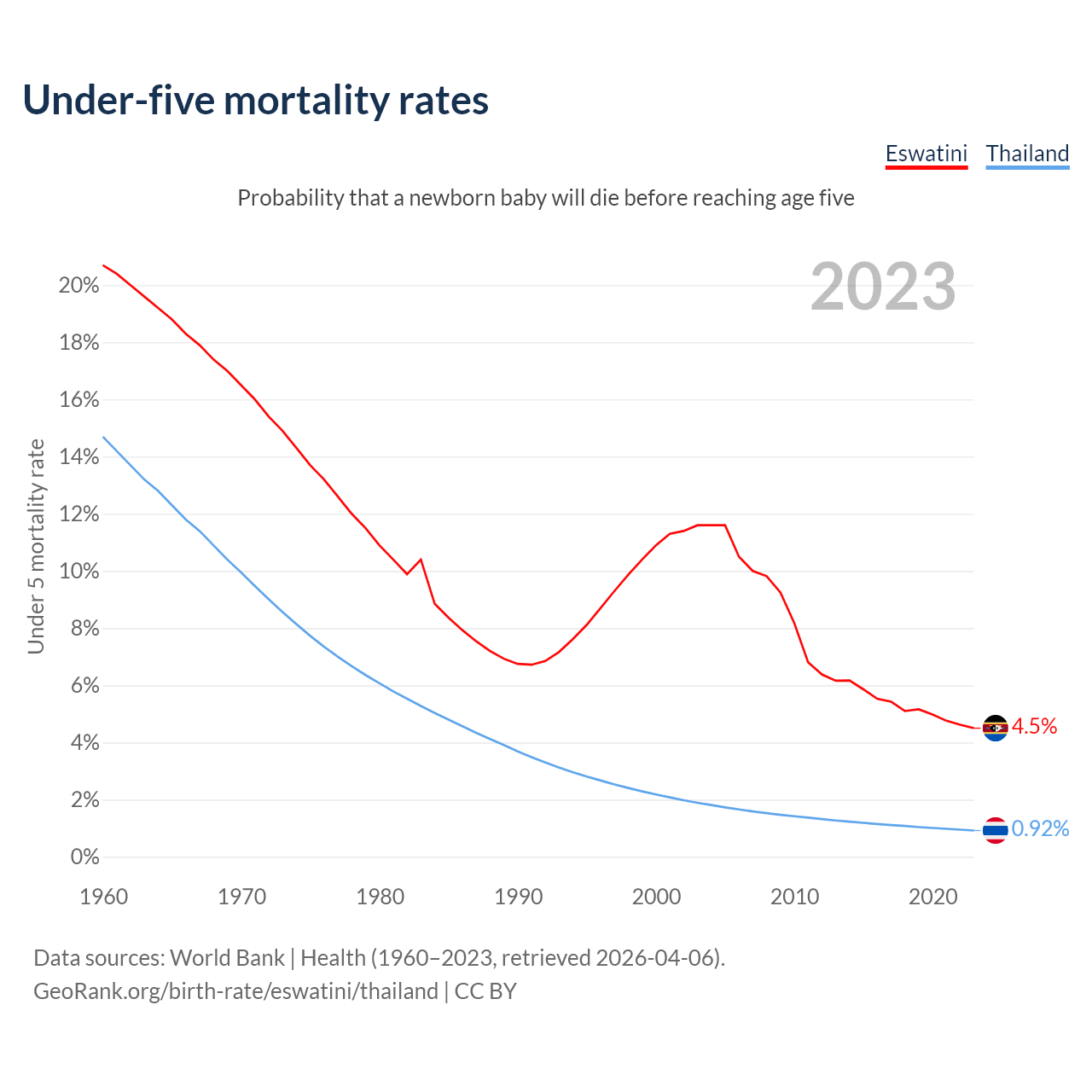 The chance that a newborn baby will die before reaching age five is 4.5% in Eswatini and 0.92% in Thailand. Above is a chart with historical data on under-five mortality rates.