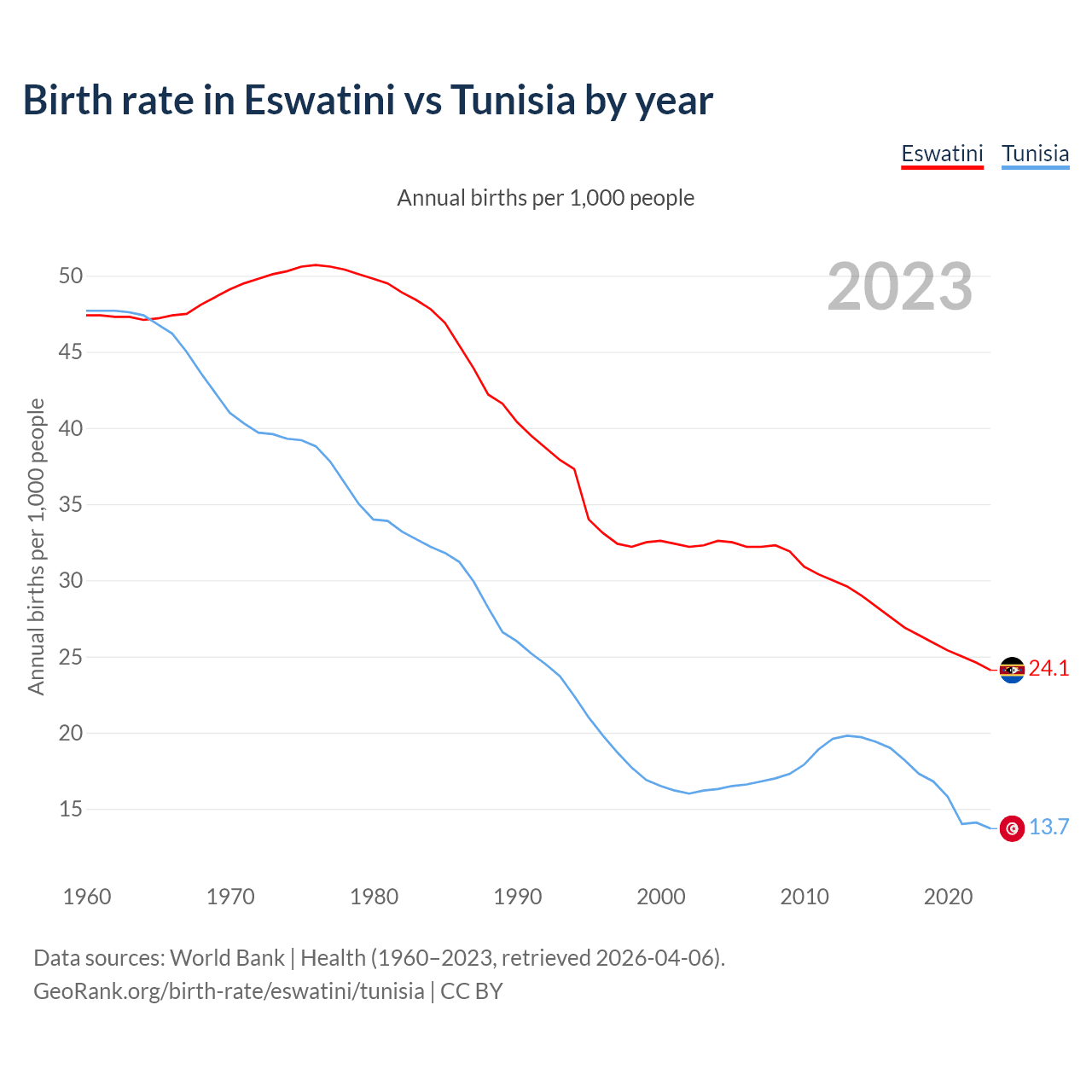 Eswatini has an annual birth rate of 24.1 births per 1,000 people, compared to 13.7 for Tunisia. The average number of children a woman is expected to have during her lifetime — the fertility rate, is 2.75 in Eswatini and 1.83 in Tunisia — 33.5% difference.