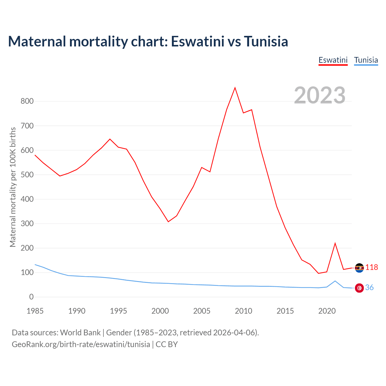 The maternal mortality rate, which is the probability of dying during childbirth or within 42 days of pregnancy termination, is 118 deaths per 100,000 live births in Eswatini, compared to 36 deaths in Tunisia.