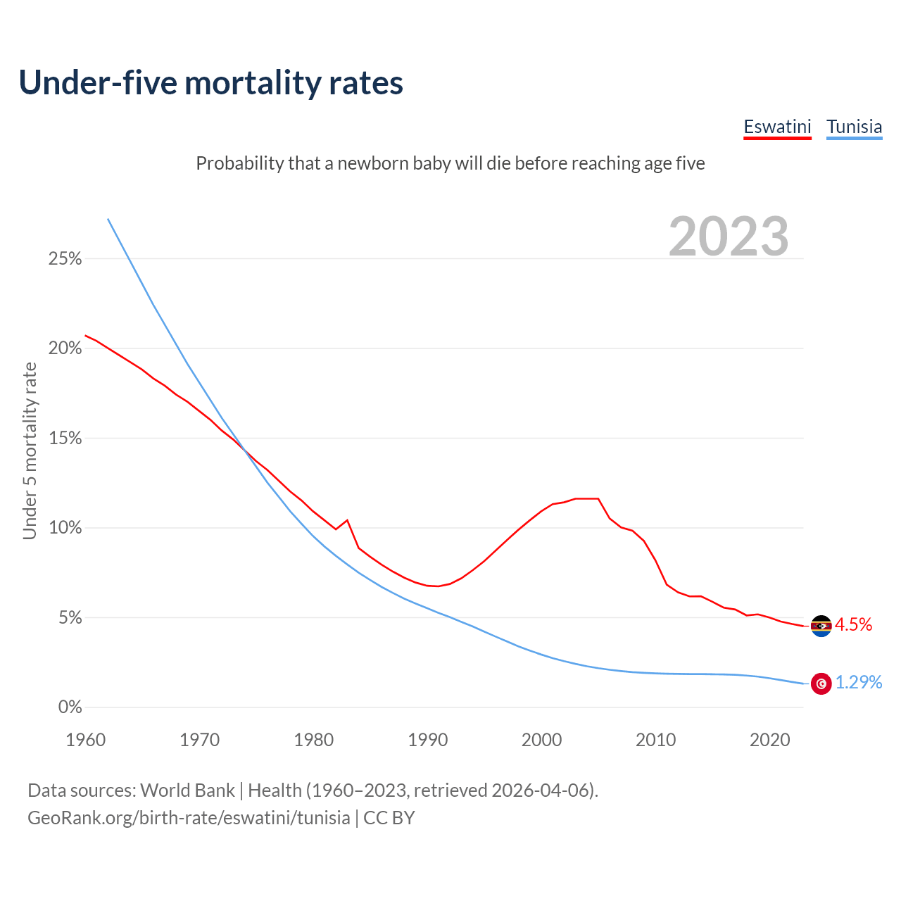 The chance that a newborn baby will die before reaching age five is 4.5% in Eswatini and 1.29% in Tunisia. Above is a chart with historical data on under-five mortality rates.