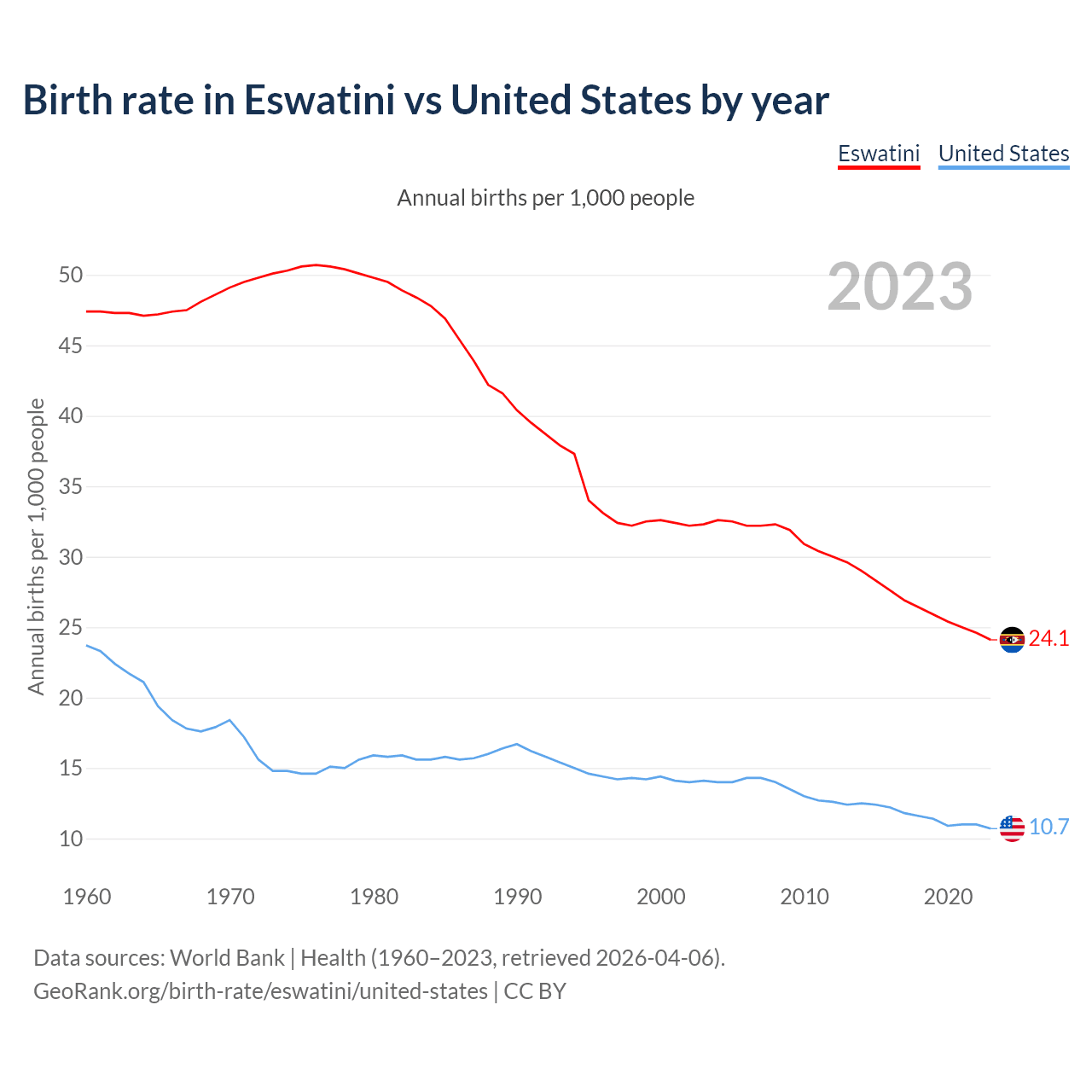 According to the latest available data on birth rates, the fertility rate in Eswatini was 2.75 children per woman in 2023, compared to 1.62 in the United States in 2023. The replacement level is considered to be 2.1 children per woman.