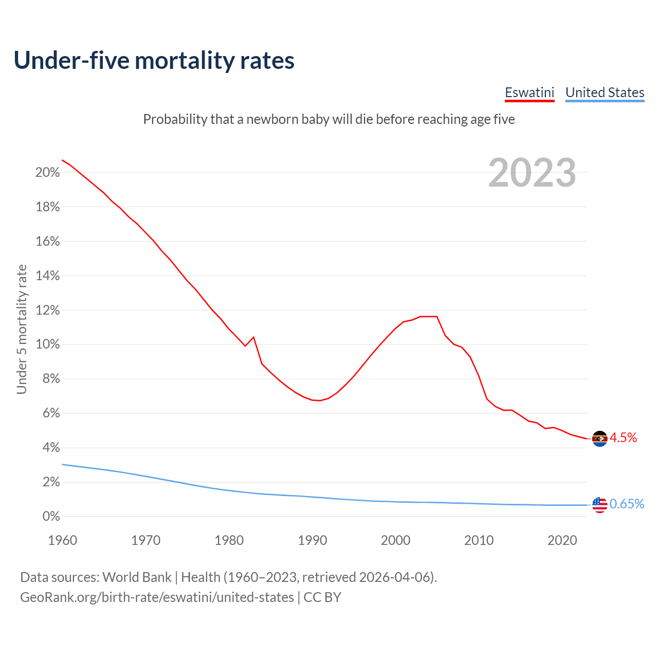 The chance that a newborn baby will die before reaching age five is 4.5% in Eswatini and 0.65% in the United States. Above is a chart with historical data on under-five mortality rates.