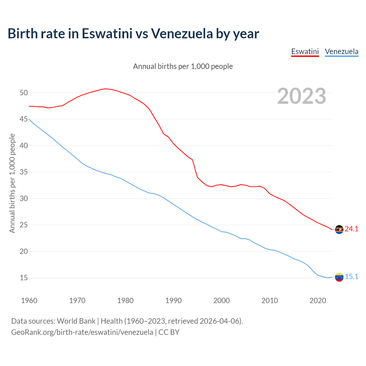 Eswatini has an annual birth rate of 24.1 births per 1,000 people, compared to 15.1 for Venezuela. The average number of children a woman is expected to have during her lifetime — the fertility rate, is 2.75 in Eswatini and 2.08 in Venezuela — 24.5% difference.