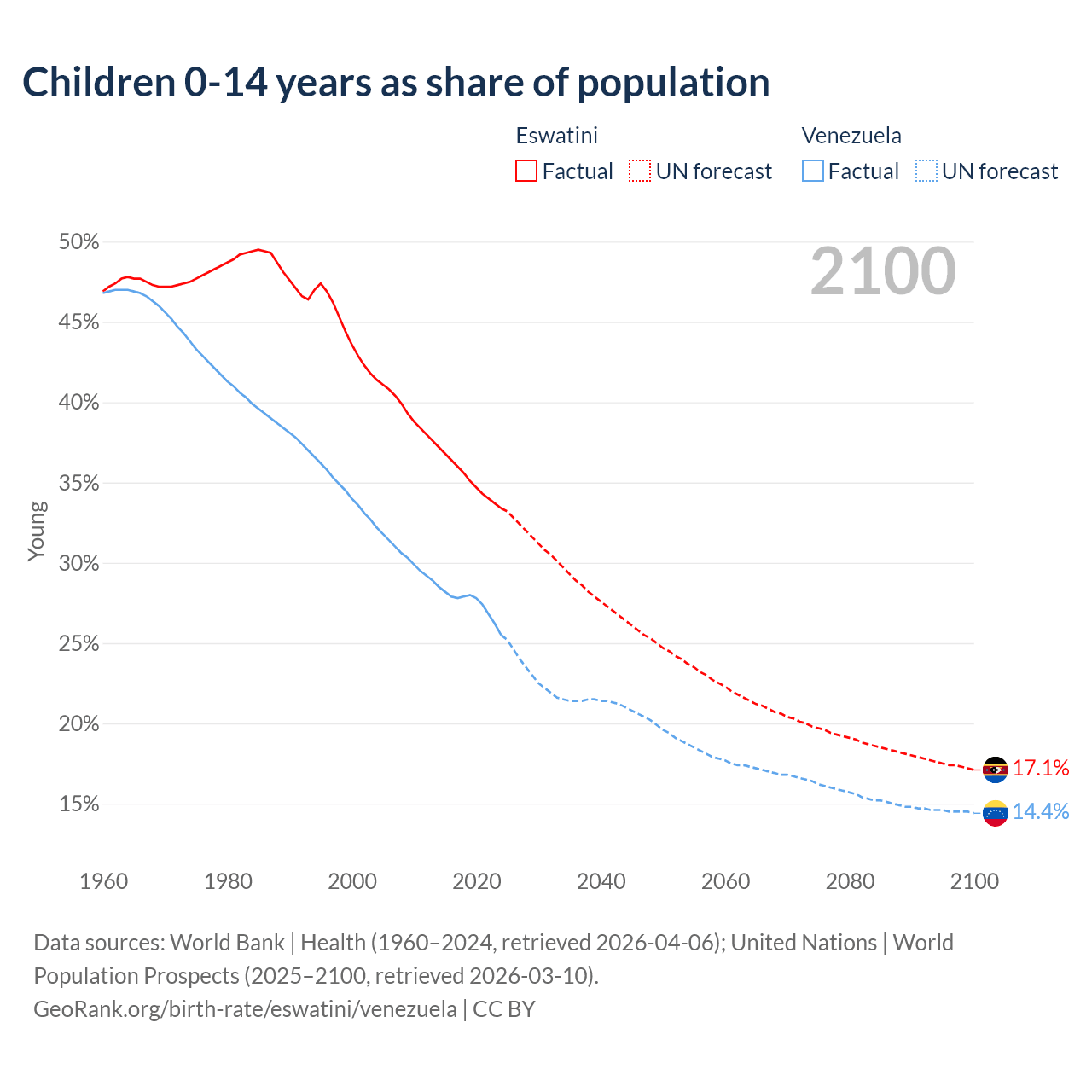 According to the latest available data on birth rates, the fertility rate in Eswatini was 2.75 children per woman in 2023, compared to 2.08 in Venezuela in 2023. The replacement level is considered to be 2.1 children per woman.