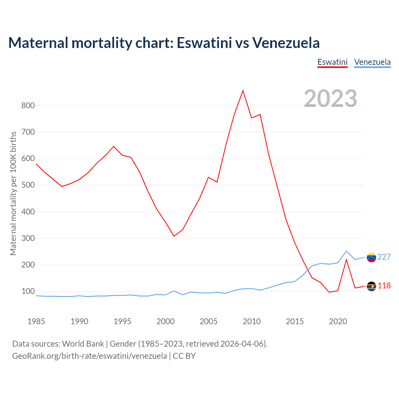 The maternal mortality rate, which is the probability of dying during childbirth or within 42 days of pregnancy termination, is 118 deaths per 100,000 live births in Eswatini, compared to 227 deaths in Venezuela.