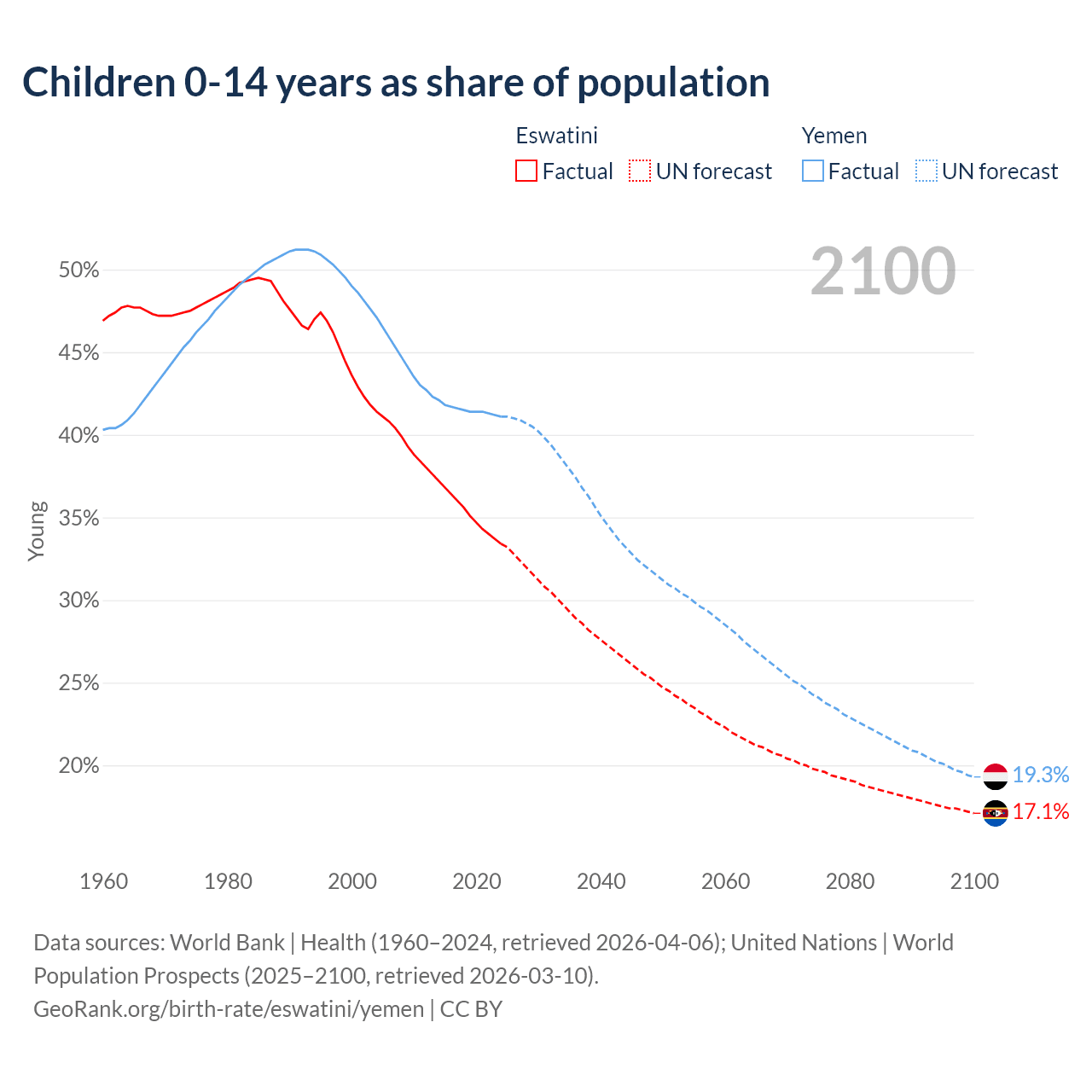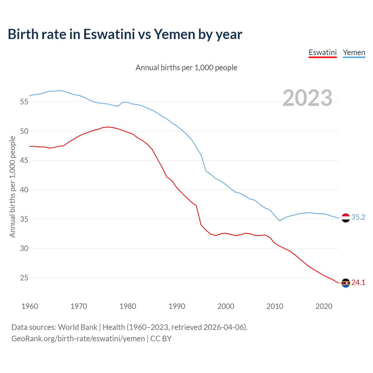 Eswatini has an annual birth rate of 24.1 births per 1,000 people, compared to 35.2 for Yemen. The average number of children a woman is expected to have during her lifetime — the fertility rate, is 2.75 in Eswatini and 4.59 in Yemen — 66.7% difference.