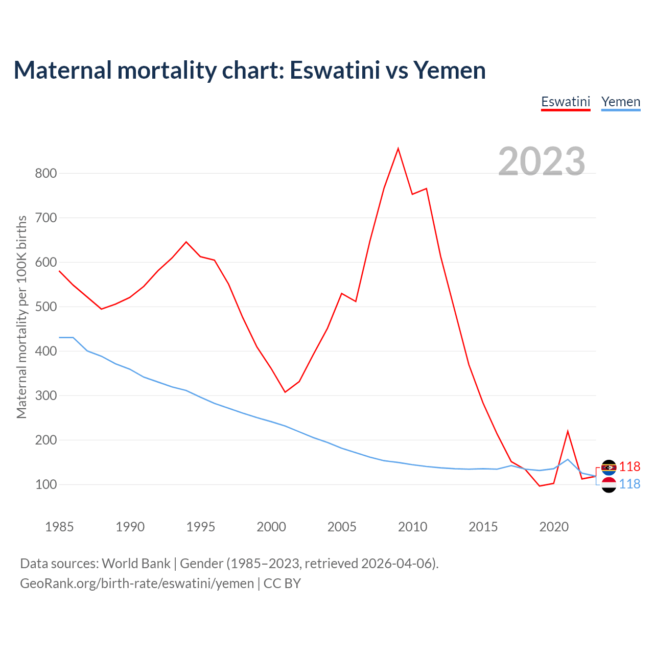 The maternal mortality rate, which is the probability of dying during childbirth or within 42 days of pregnancy termination, is 118 deaths per 100,000 live births in Eswatini, compared to 118 deaths in Yemen.