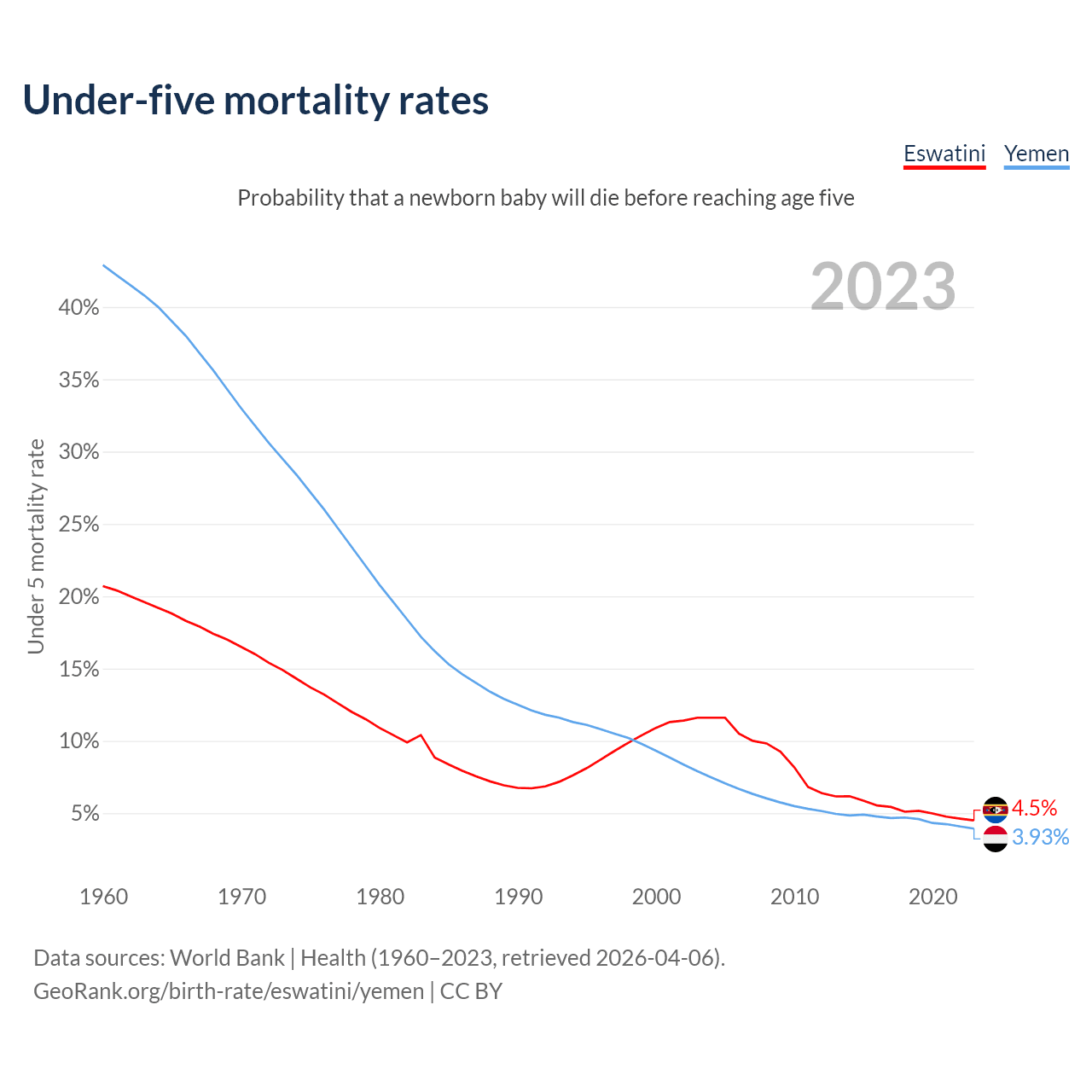 The chance that a newborn baby will die before reaching age five is 4.5% in Eswatini and 3.93% in Yemen. Above is a chart with historical data on under-five mortality rates.