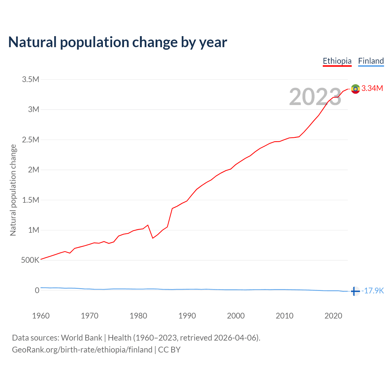 According to the latest available data on birth rates, the fertility rate in Ethiopia was 3.99 children per woman in 2023, compared to 1.26 in Finland in 2023. The replacement level is considered to be 2.1 children per woman.