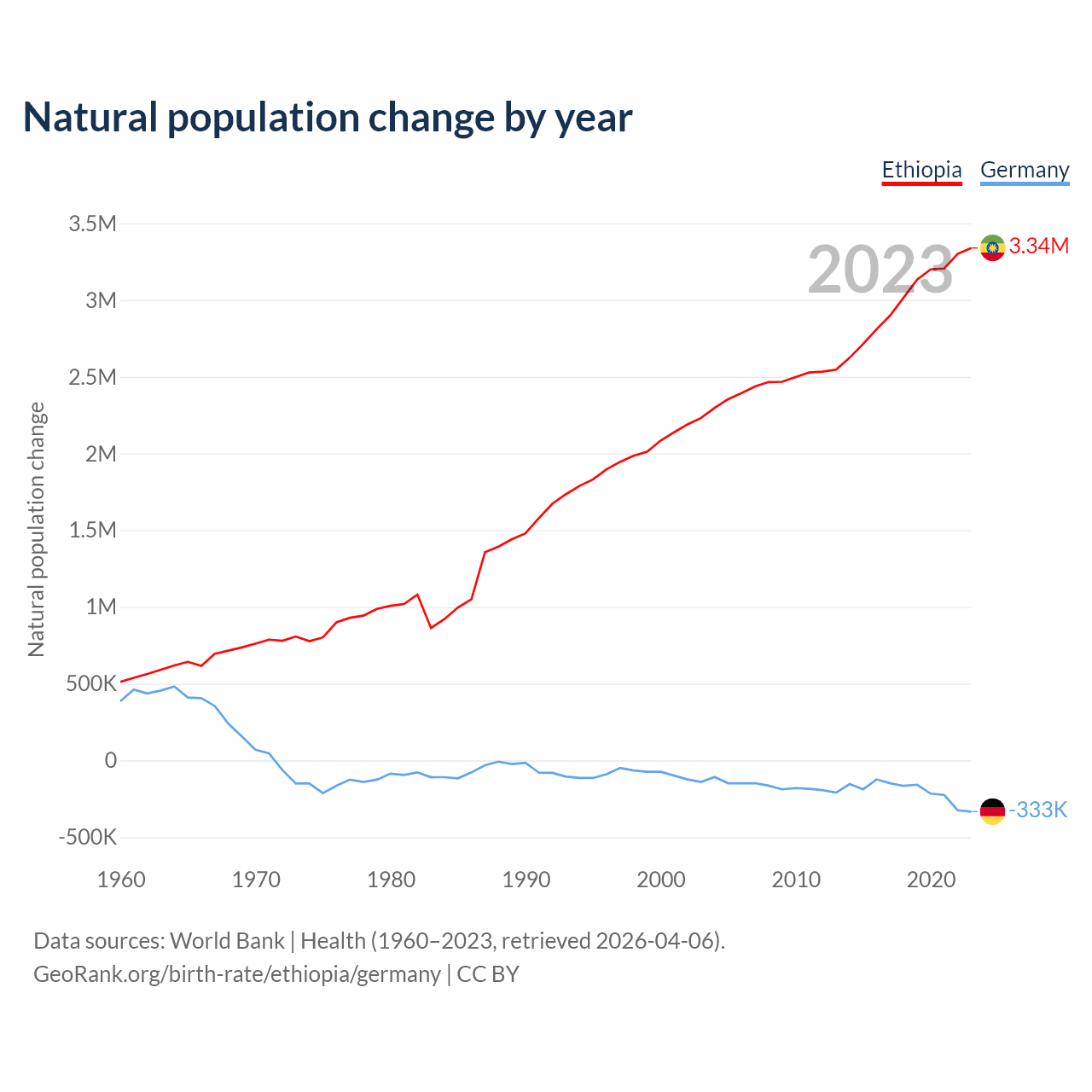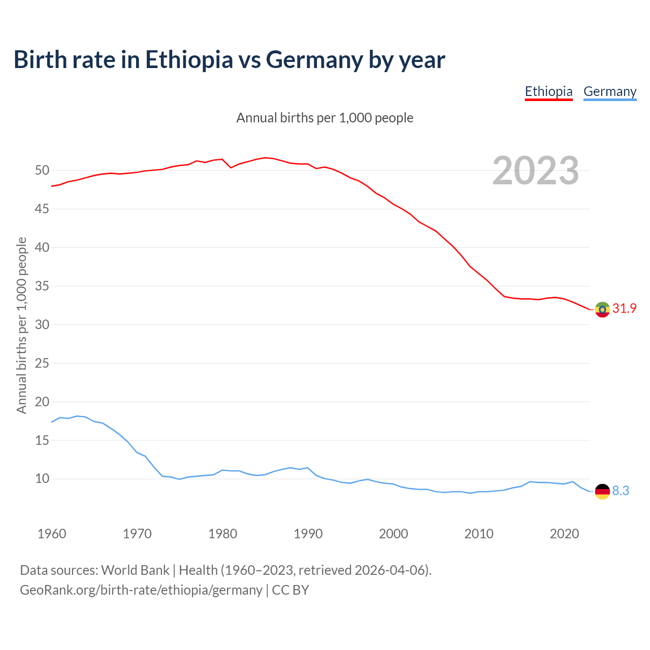 Ethiopia has an annual birth rate of 31.9 births per 1,000 people, compared to 8.3 for Germany. The average number of children a woman is expected to have during her lifetime — the fertility rate, is 3.99 in Ethiopia and 1.39 in Germany — 65.2% difference.