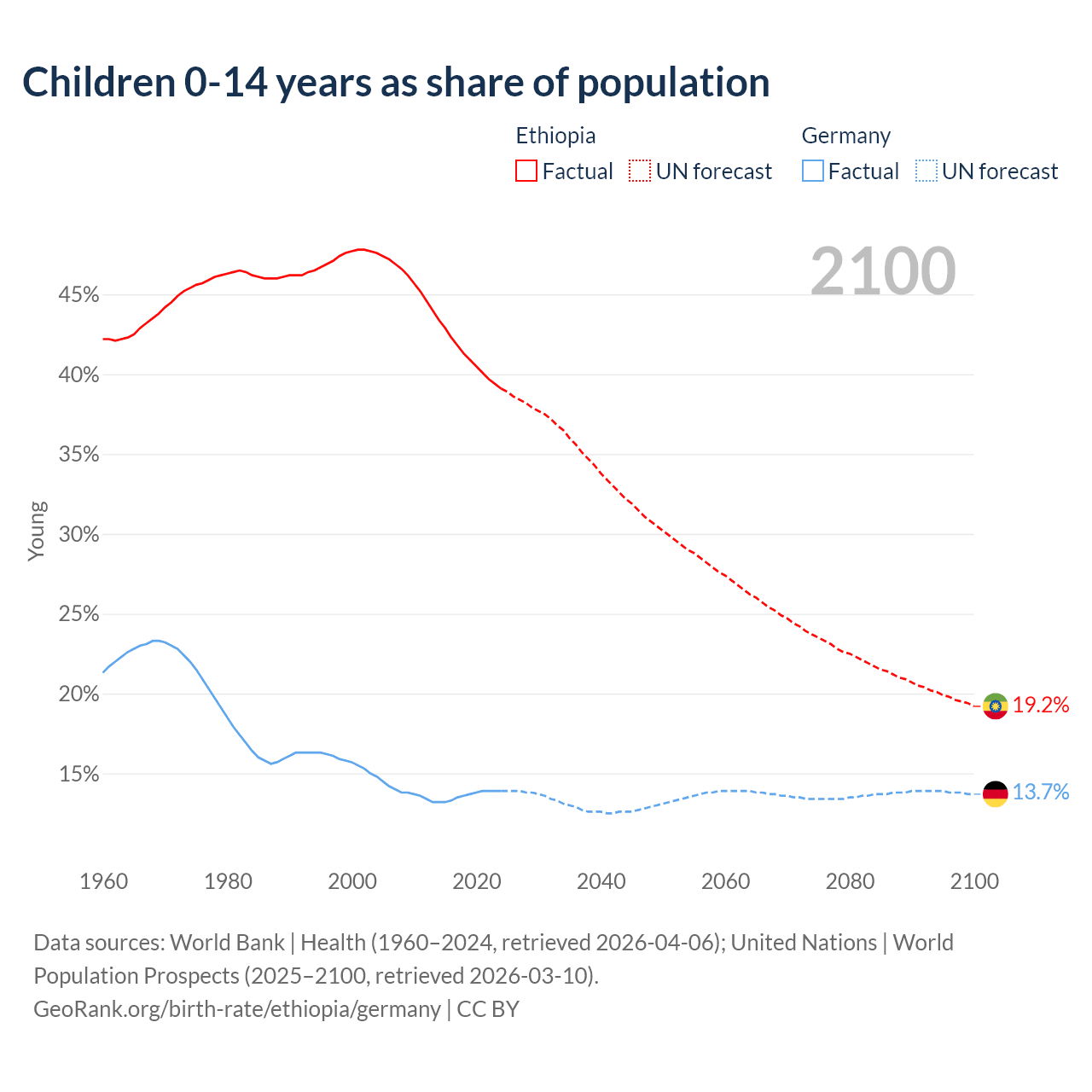 According to the latest available data on birth rates, the fertility rate in Ethiopia was 3.99 children per woman in 2023, compared to 1.39 in Germany in 2023. The replacement level is considered to be 2.1 children per woman.