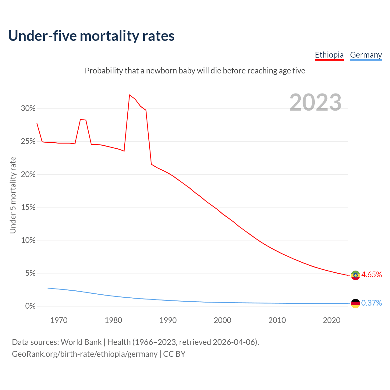 The chance that a newborn baby will die before reaching age five is 4.65% in Ethiopia and 0.37% in Germany. Above is a chart with historical data on under-five mortality rates.