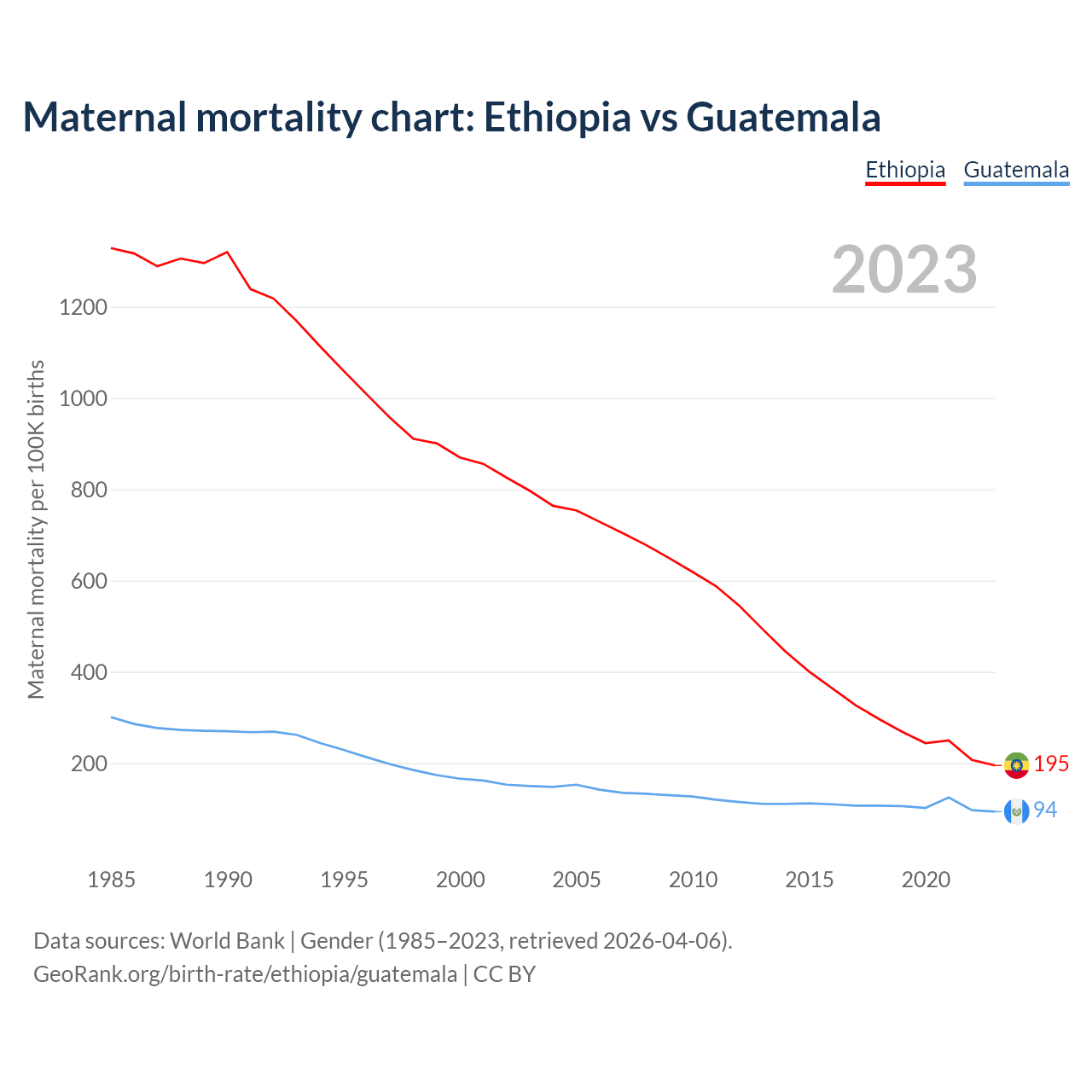 The maternal mortality rate, which is the probability of dying during childbirth or within 42 days of pregnancy termination, is 195 deaths per 100,000 live births in Ethiopia, compared to 94 deaths in Guatemala.