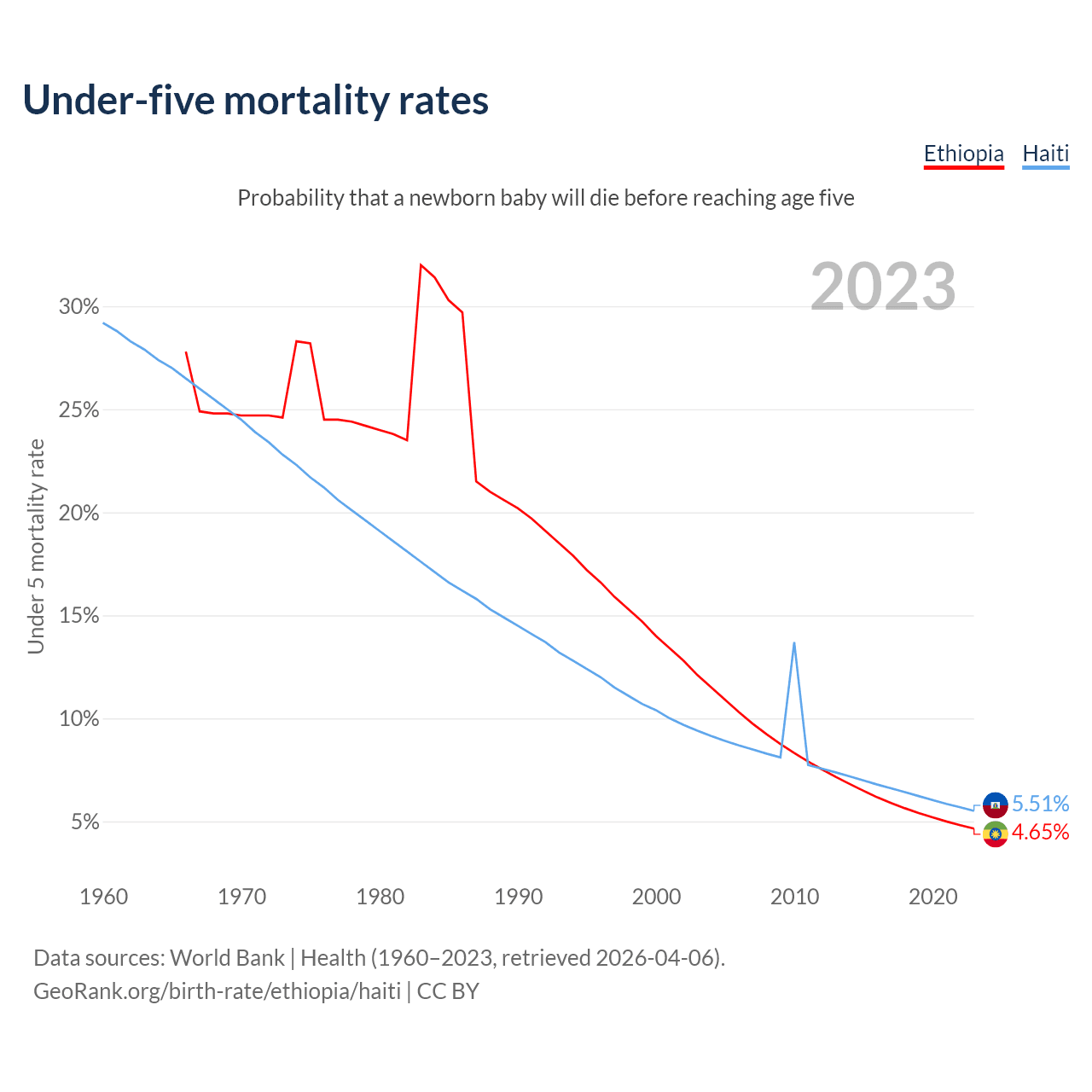 The chance that a newborn baby will die before reaching age five is 4.65% in Ethiopia and 5.51% in Haiti. Above is a chart with historical data on under-five mortality rates.