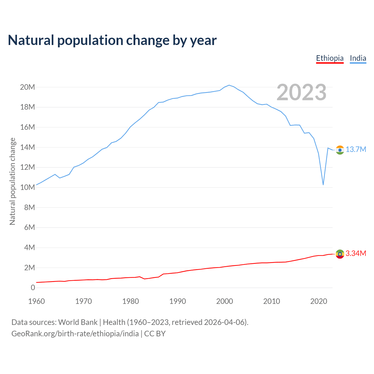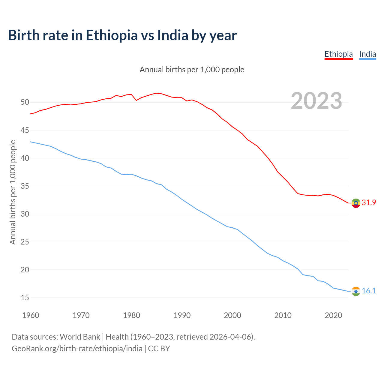 Ethiopia has an annual birth rate of 31.9 births per 1,000 people, compared to 16.1 for India. The average number of children a woman is expected to have during her lifetime — the fertility rate, is 3.99 in Ethiopia and 1.98 in India — 50.5% difference.