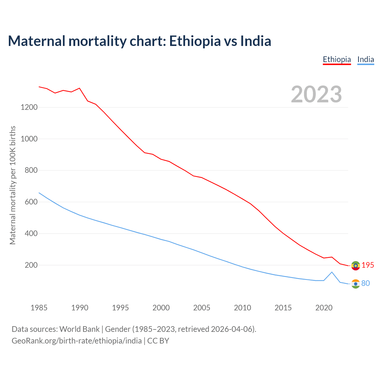 The maternal mortality rate, which is the probability of dying during childbirth or within 42 days of pregnancy termination, is 195 deaths per 100,000 live births in Ethiopia, compared to 80 deaths in India.