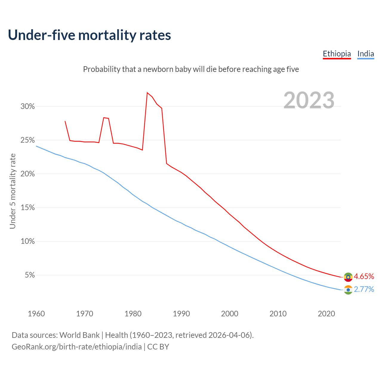 The chance that a newborn baby will die before reaching age five is 4.65% in Ethiopia and 2.77% in India. Above is a chart with historical data on under-five mortality rates.