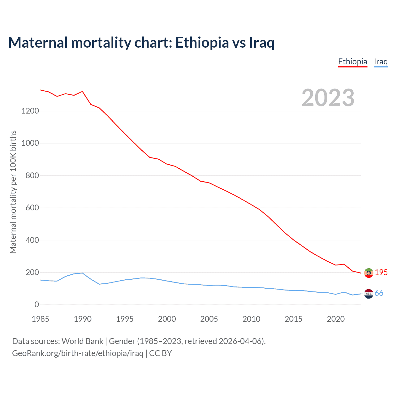 The maternal mortality rate, which is the probability of dying during childbirth or within 42 days of pregnancy termination, is 195 deaths per 100,000 live births in Ethiopia, compared to 66 deaths in Iraq.