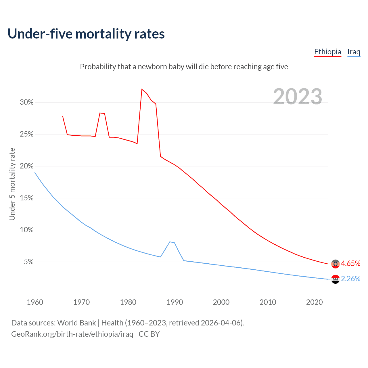 The chance that a newborn baby will die before reaching age five is 4.65% in Ethiopia and 2.26% in Iraq. Above is a chart with historical data on under-five mortality rates.
