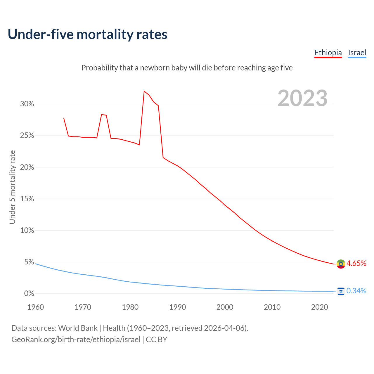 The chance that a newborn baby will die before reaching age five is 4.65% in Ethiopia and 0.34% in Israel. Above is a chart with historical data on under-five mortality rates.