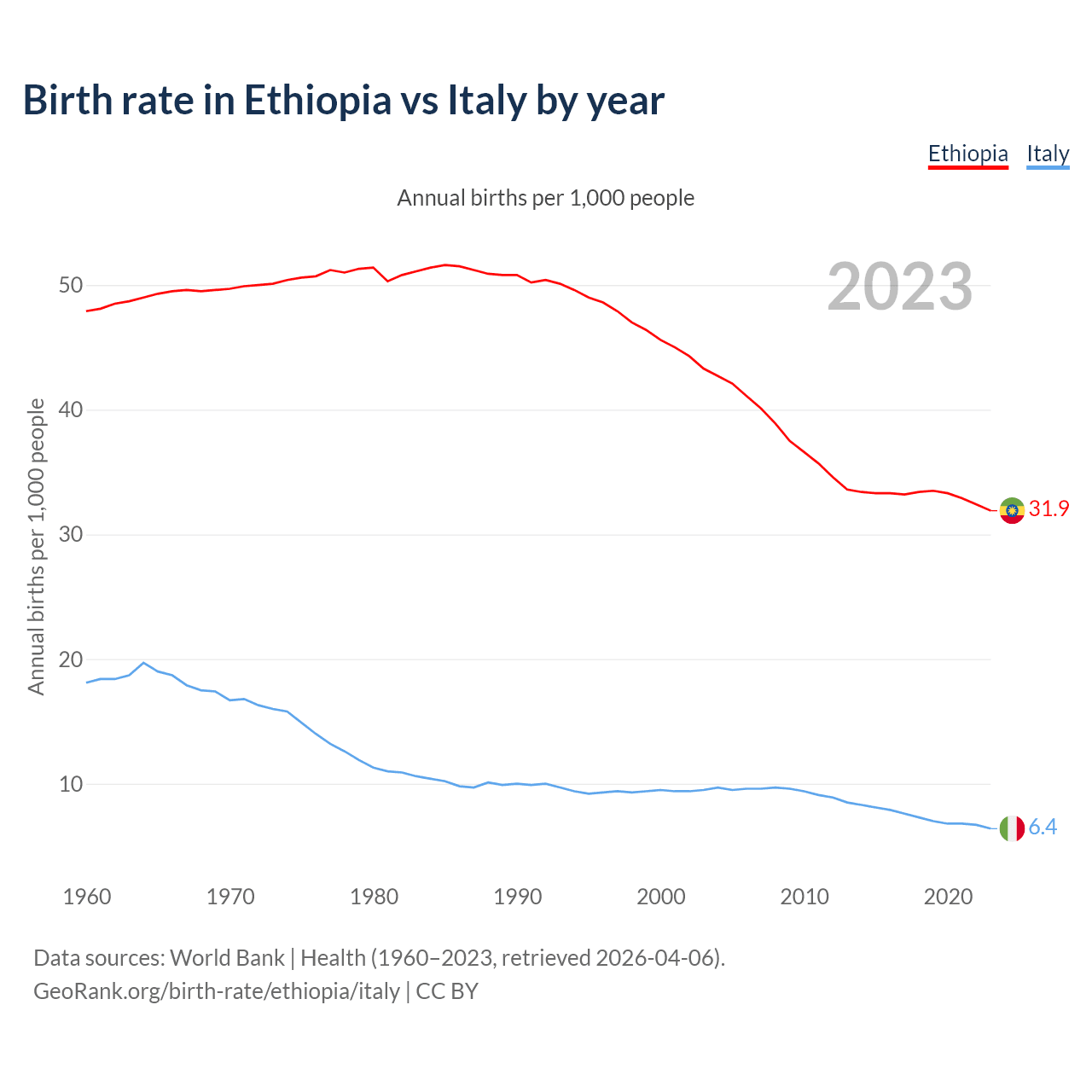Ethiopia has an annual birth rate of 31.9 births per 1,000 people, compared to 6.4 for Italy. The average number of children a woman is expected to have during her lifetime — the fertility rate, is 3.99 in Ethiopia and 1.2 in Italy — 69.9% difference.