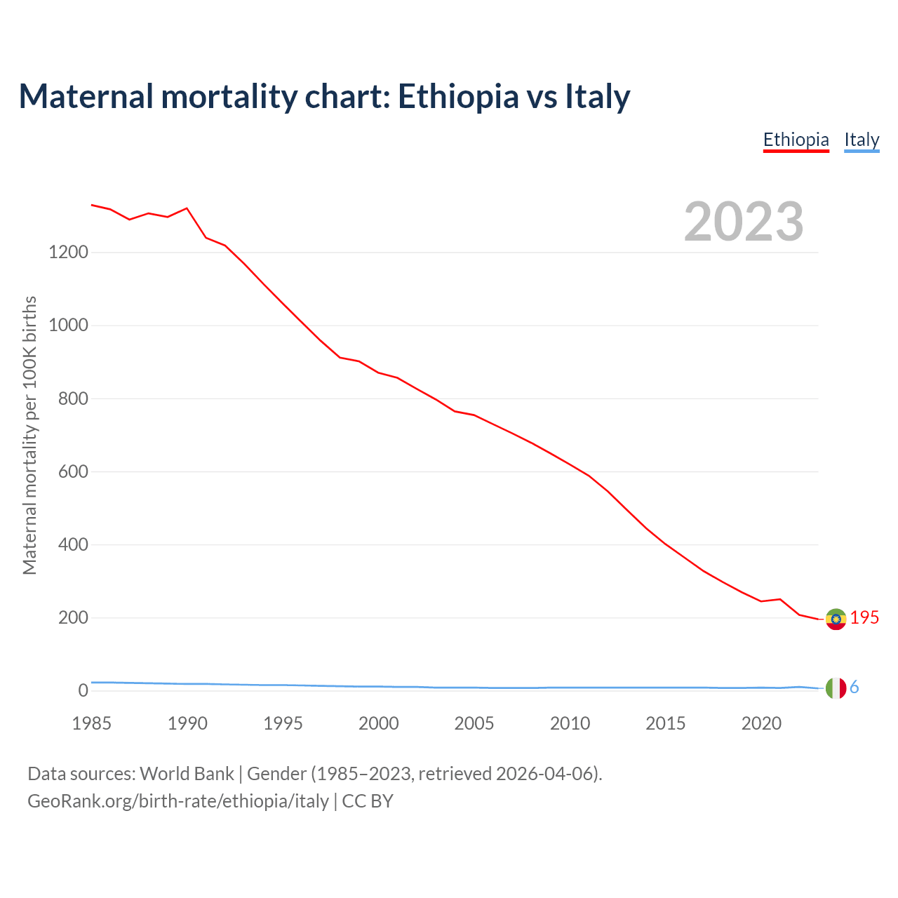 The maternal mortality rate, which is the probability of dying during childbirth or within 42 days of pregnancy termination, is 195 deaths per 100,000 live births in Ethiopia, compared to 6 deaths in Italy.