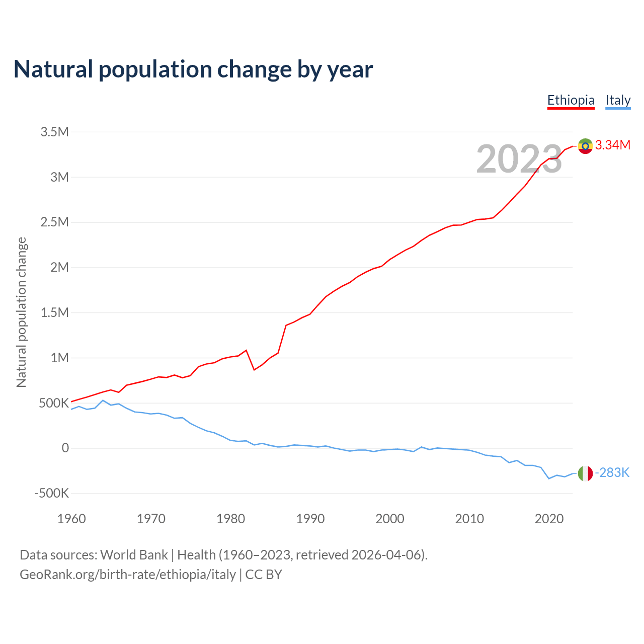 According to the latest available data on birth rates, the fertility rate in Ethiopia was 3.99 children per woman in 2023, compared to 1.2 in Italy in 2023. The replacement level is considered to be 2.1 children per woman.