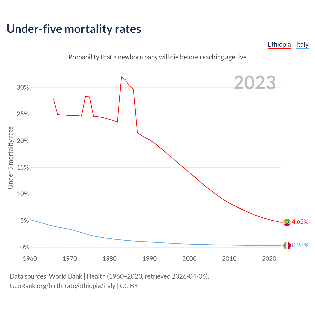 The chance that a newborn baby will die before reaching age five is 4.65% in Ethiopia and 0.28% in Italy. Above is a chart with historical data on under-five mortality rates.
