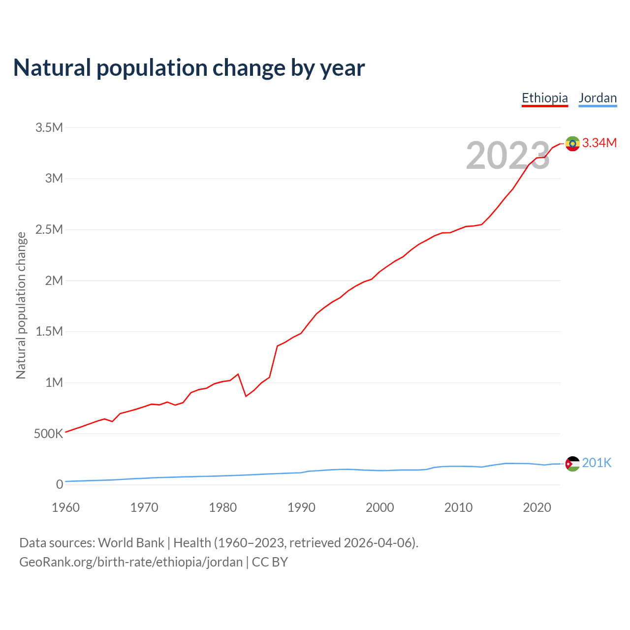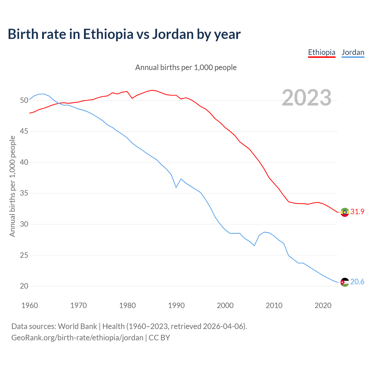 Ethiopia has an annual birth rate of 31.9 births per 1,000 people, compared to 20.6 for Jordan. The average number of children a woman is expected to have during her lifetime — the fertility rate, is 3.99 in Ethiopia and 2.64 in Jordan — 33.8% difference.