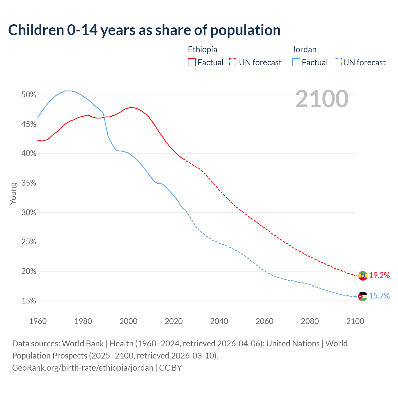 According to the latest available data on birth rates, the fertility rate in Ethiopia was 3.99 children per woman in 2023, compared to 2.64 in Jordan in 2023. The replacement level is considered to be 2.1 children per woman.