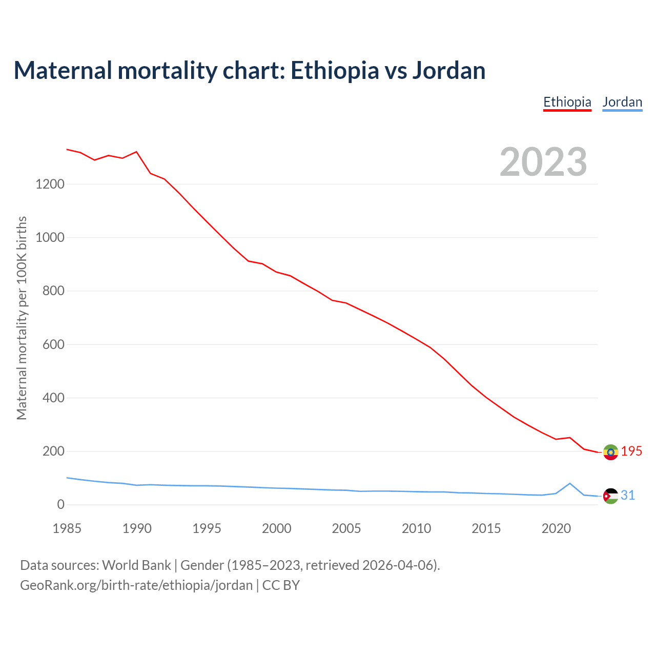 The maternal mortality rate, which is the probability of dying during childbirth or within 42 days of pregnancy termination, is 195 deaths per 100,000 live births in Ethiopia, compared to 31 deaths in Jordan.