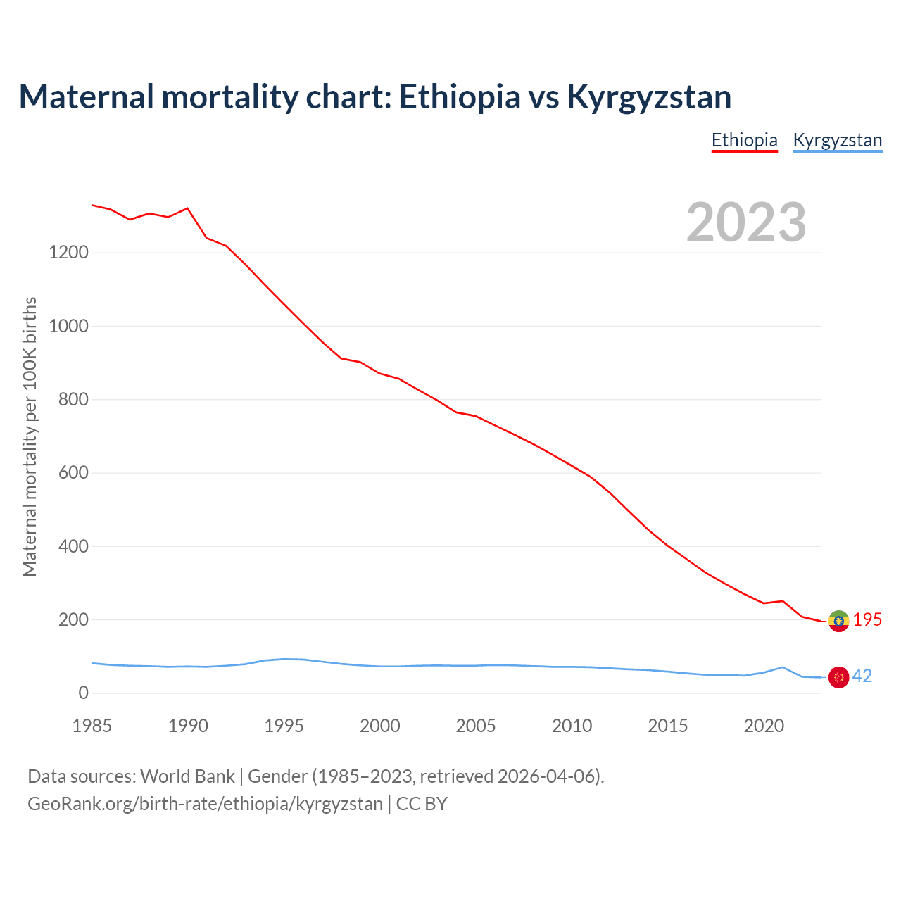 The maternal mortality rate, which is the probability of dying during childbirth or within 42 days of pregnancy termination, is 195 deaths per 100,000 live births in Ethiopia, compared to 42 deaths in Kyrgyzstan.