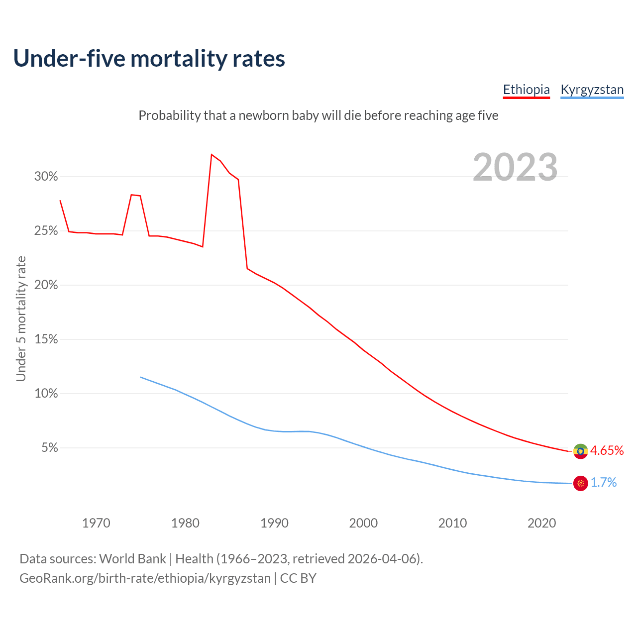 The chance that a newborn baby will die before reaching age five is 4.65% in Ethiopia and 1.7% in Kyrgyzstan. Above is a chart with historical data on under-five mortality rates.