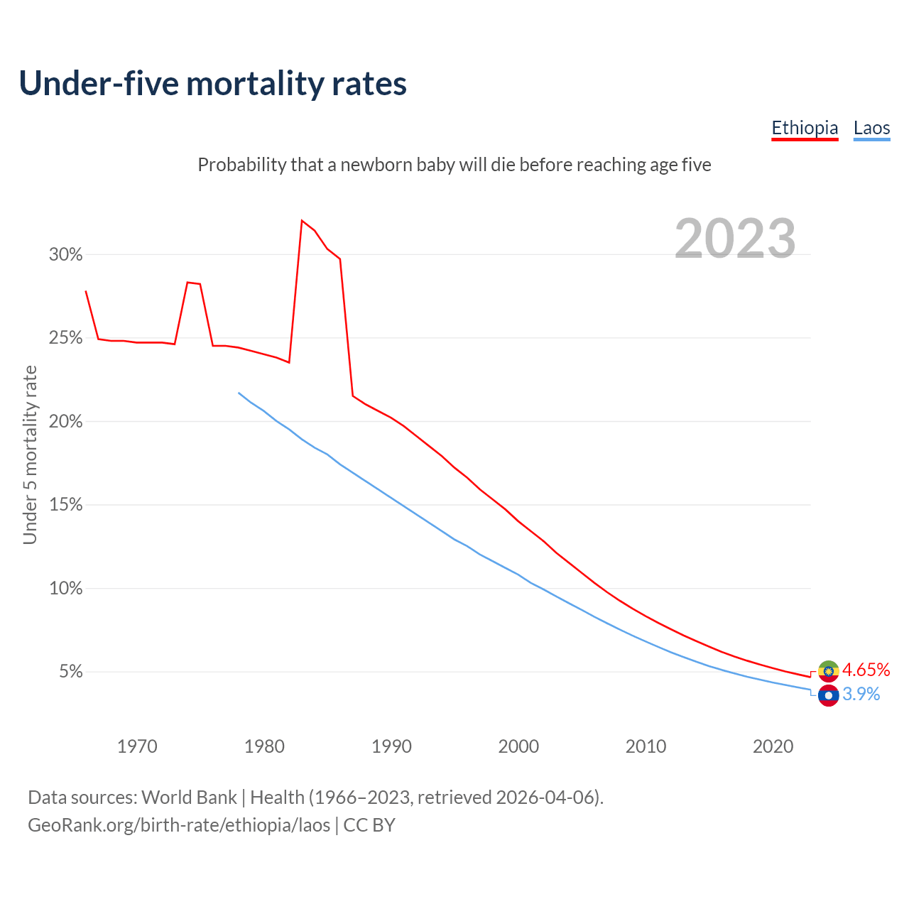 The chance that a newborn baby will die before reaching age five is 4.65% in Ethiopia and 3.9% in Laos. Above is a chart with historical data on under-five mortality rates.