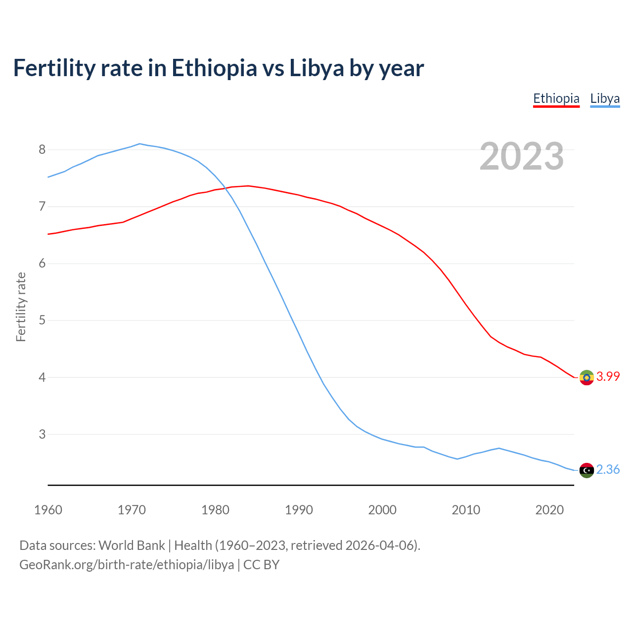1960 vs 2023, the fertility rate has decreased by 38.8% in Ethiopia and by 68.6% in Libya — in 1960, it was 6.51 and 7.51, respectively.