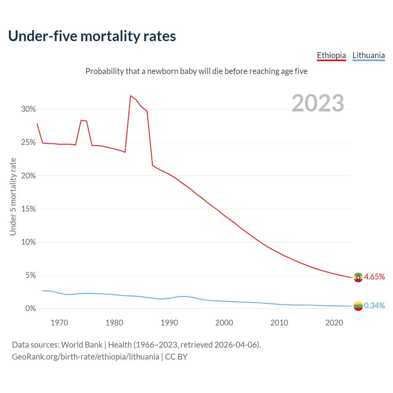 The chance that a newborn baby will die before reaching age five is 4.65% in Ethiopia and 0.34% in Lithuania. Above is a chart with historical data on under-five mortality rates.