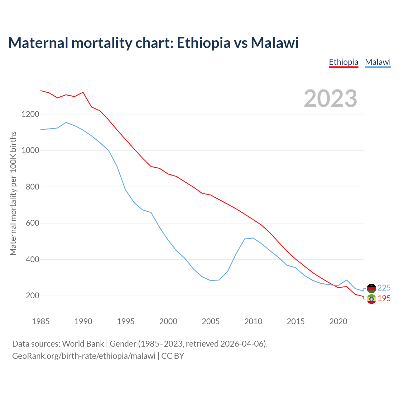 The maternal mortality rate, which is the probability of dying during childbirth or within 42 days of pregnancy termination, is 195 deaths per 100,000 live births in Ethiopia, compared to 225 deaths in Malawi.