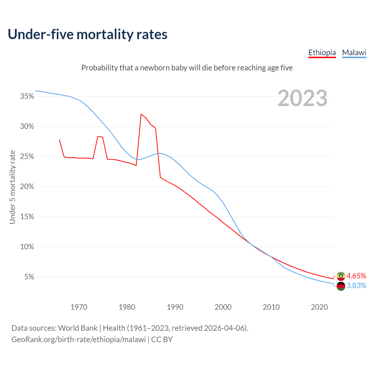 The chance that a newborn baby will die before reaching age five is 4.65% in Ethiopia and 3.83% in Malawi. Above is a chart with historical data on under-five mortality rates.