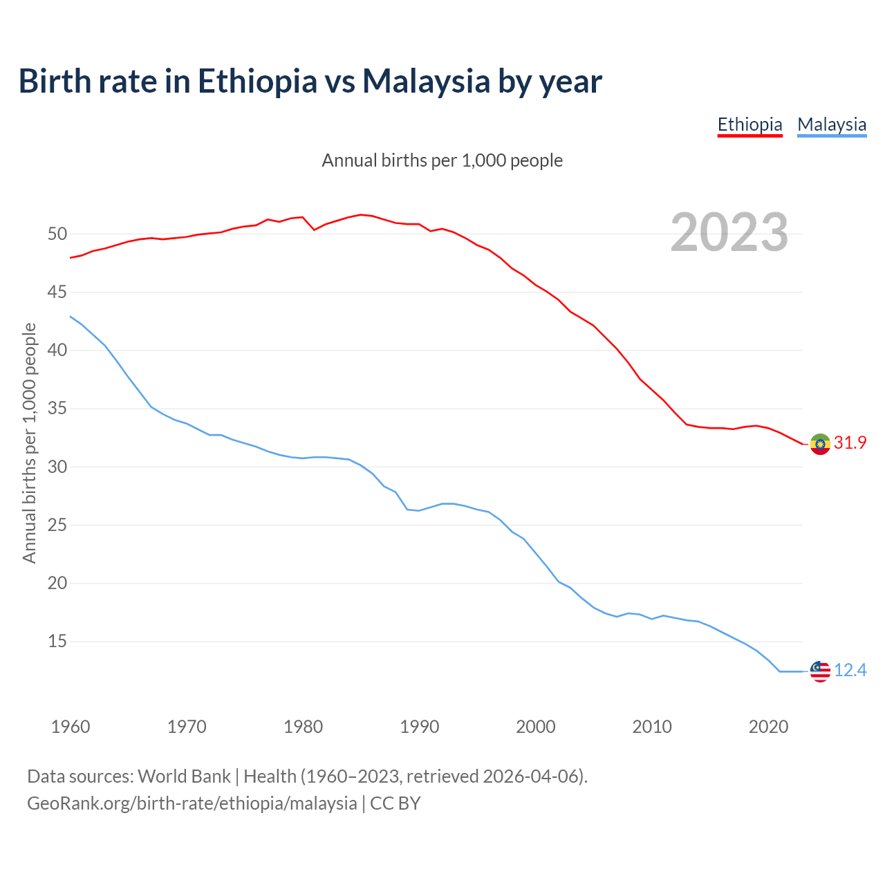 According to the latest available data on birth rates, the fertility rate in Ethiopia was 3.99 children per woman in 2023, compared to 1.55 in Malaysia in 2023. The replacement level is considered to be 2.1 children per woman.