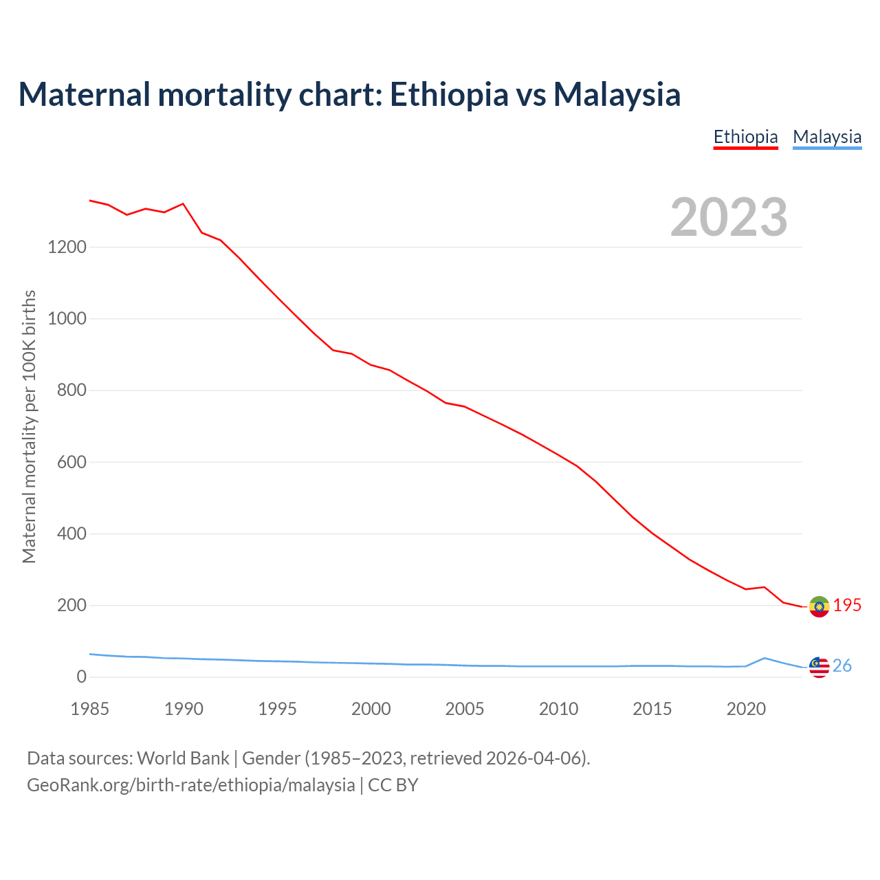 The maternal mortality rate, which is the probability of dying during childbirth or within 42 days of pregnancy termination, is 195 deaths per 100,000 live births in Ethiopia, compared to 26 deaths in Malaysia.