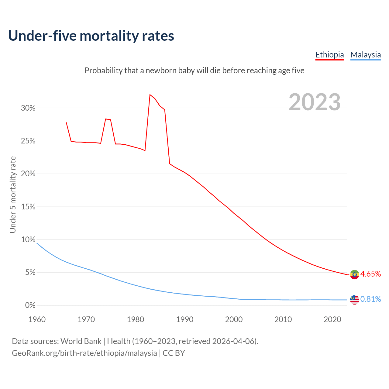 The chance that a newborn baby will die before reaching age five is 4.65% in Ethiopia and 0.81% in Malaysia. Above is a chart with historical data on under-five mortality rates.