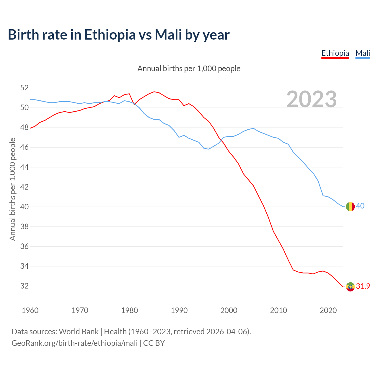 Ethiopia has an annual birth rate of 31.9 births per 1,000 people, compared to 40 for Mali. The average number of children a woman is expected to have during her lifetime — the fertility rate, is 3.99 in Ethiopia and 5.61 in Mali — 40.7% difference.