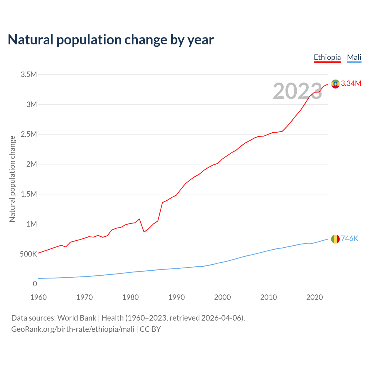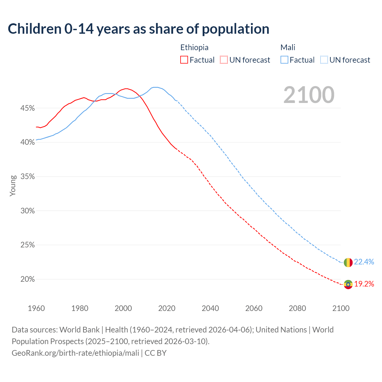 According to the latest available data on birth rates, the fertility rate in Ethiopia was 3.99 children per woman in 2023, compared to 5.61 in Mali in 2023. The replacement level is considered to be 2.1 children per woman.