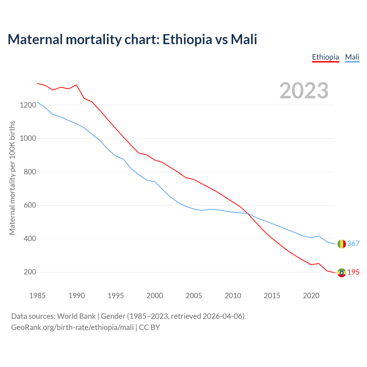 - Annual births per 1,000 women ages 15-19 (adolescent birth rate or teenage mother rate) is 69.9 in Ethiopia vs 138.6 in Mali.