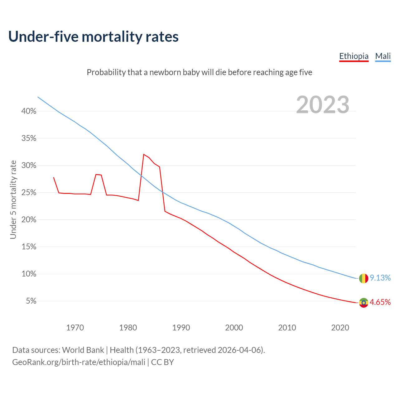 The chance that a newborn baby will die before reaching age five is 4.65% in Ethiopia and 9.13% in Mali. Above is a chart with historical data on under-five mortality rates.