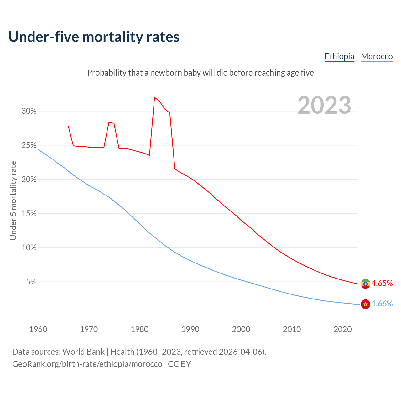 The chance that a newborn baby will die before reaching age five is 4.65% in Ethiopia and 1.66% in Morocco. Above is a chart with historical data on under-five mortality rates.