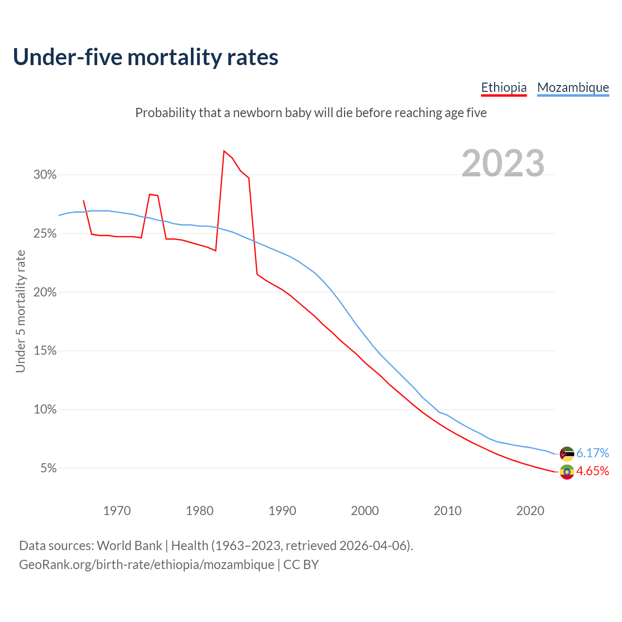 The chance that a newborn baby will die before reaching age five is 4.65% in Ethiopia and 6.17% in Mozambique. Above is a chart with historical data on under-five mortality rates.