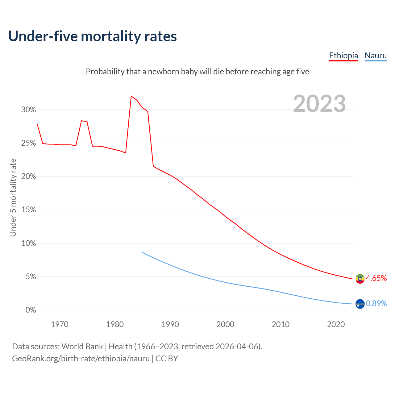 The chance that a newborn baby will die before reaching age five is 4.65% in Ethiopia and 0.89% in Nauru. Above is a chart with historical data on under-five mortality rates.